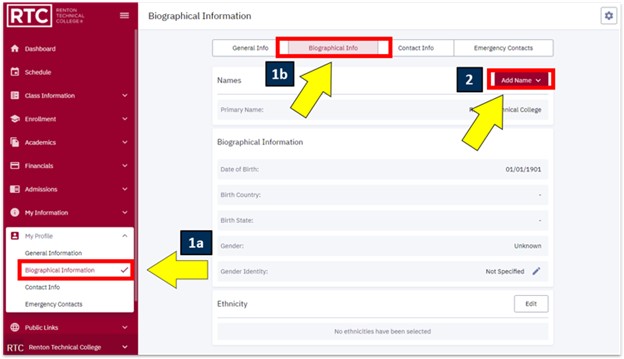 Select Biographical Information (1a) on the left or (1b) top of the screen