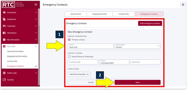 Step 2: On the left select (1) Emergency Contacts. Click on the (2) Add Contact button