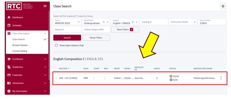 Step 6: Review Search Results, your search results will appear. Click on a listed class to expand the details.