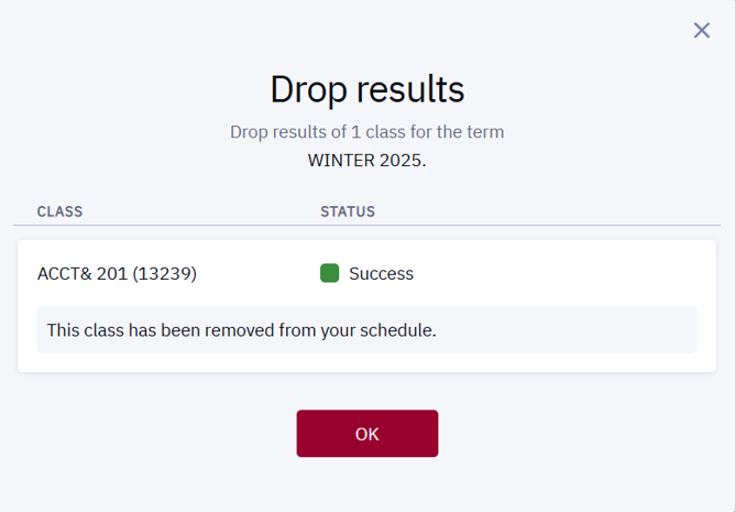 Step 9: Success: If successful, you will see confirmation that the class has been added to your schedule.